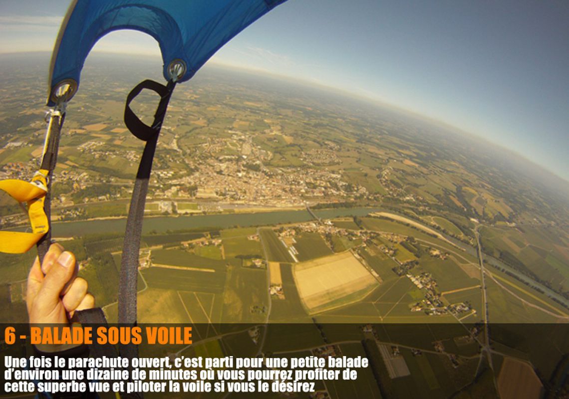 Une formation théorique de 10 minutes pour acquérir les rudiments de la chute libre et c'est parti pour environ 50 secondes de pur plaisir à 200 km/h, après l' ouverture du parachute par votre moniteur vous profiterez pleinement d'un point de vue unique pendant les 5 à 7 minutes de descente.