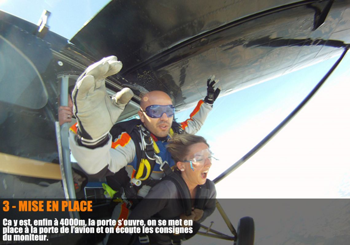 Le saut se déroule à partir de 4000 mètres d'altitude en parachute biplace avec un moniteur.